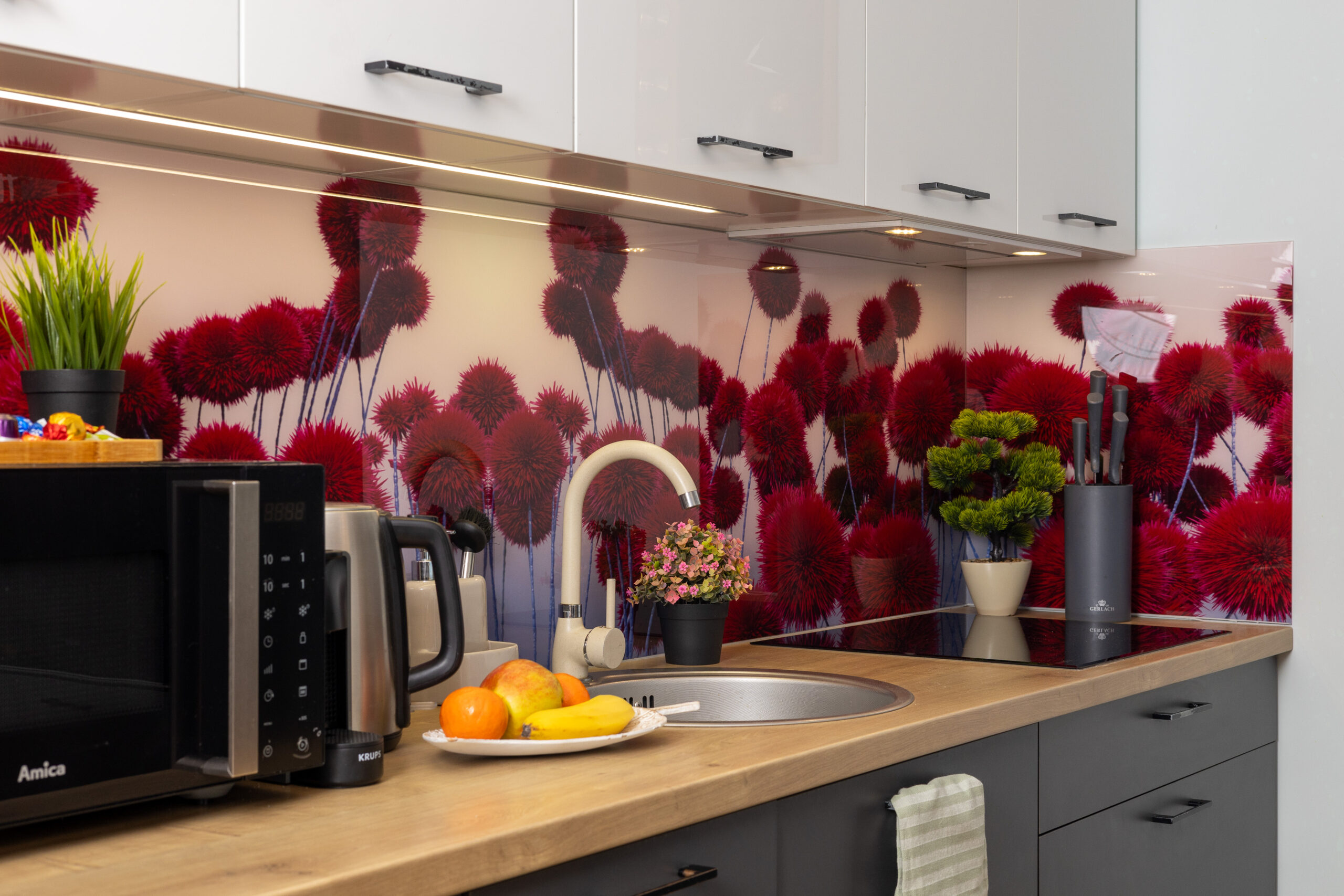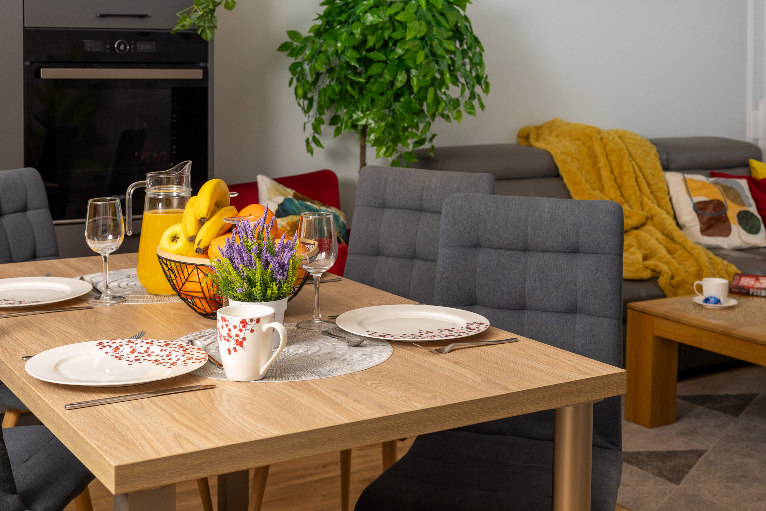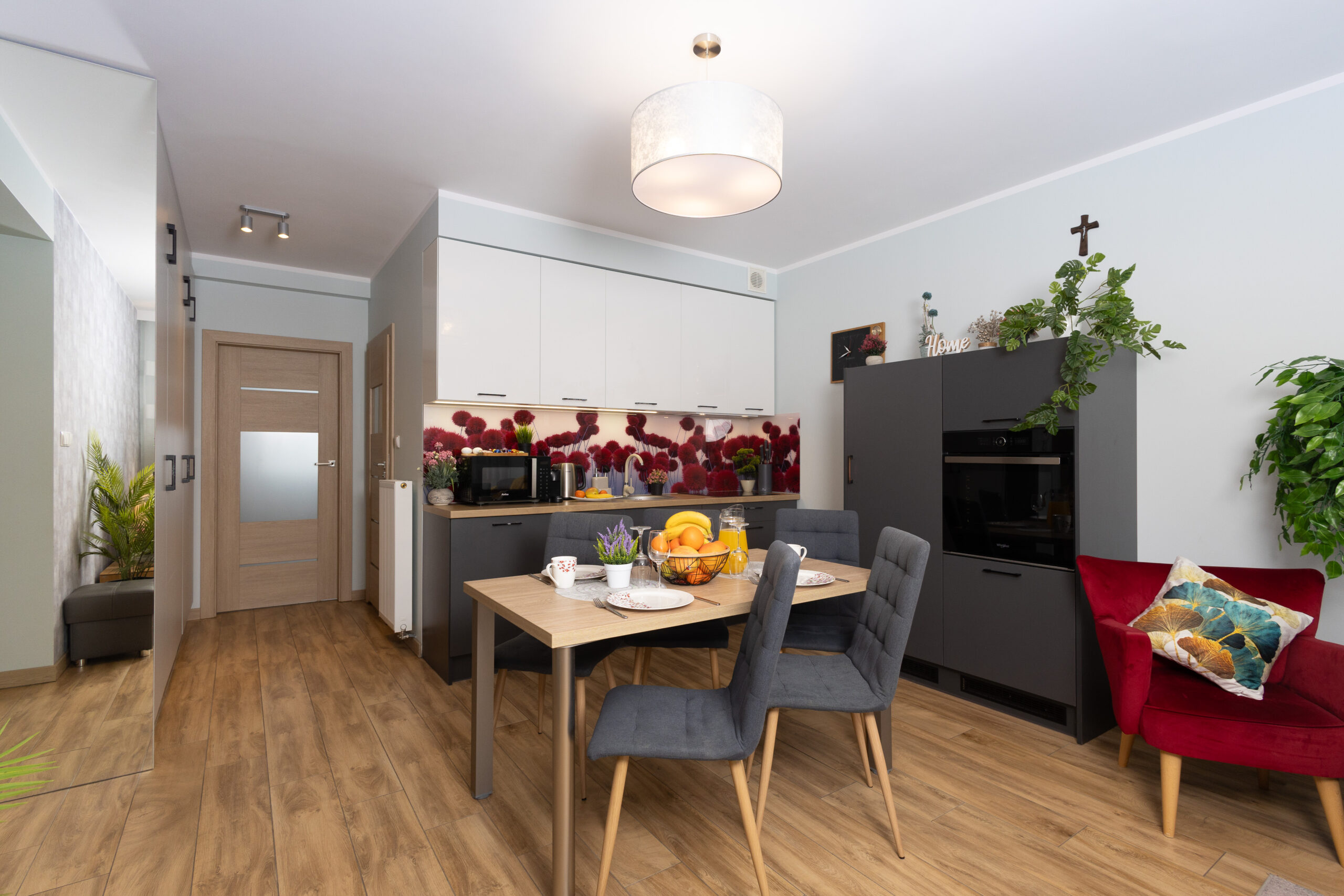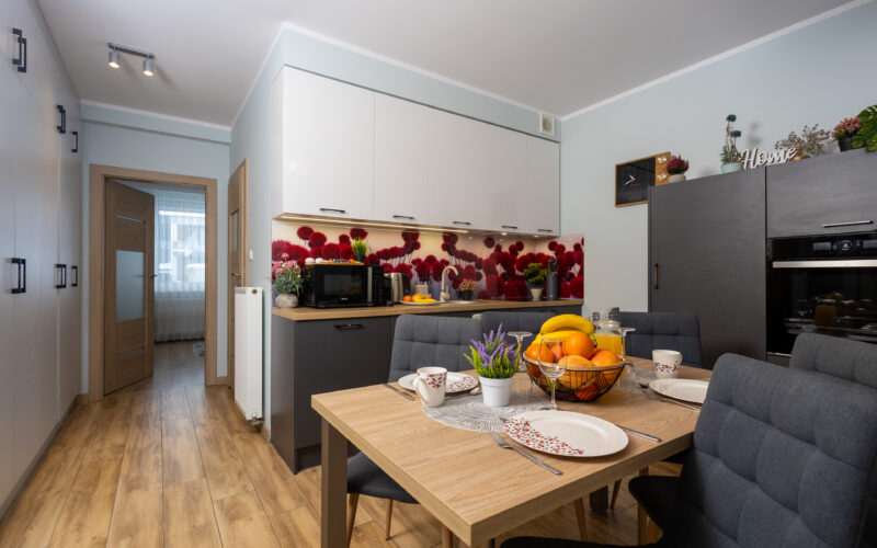 - Aneks kuchenny – jest w pełni wyposażony, znajduje się tu lodówka, zmywarka, płyta kuchenna, mikrofalówka, czajnik oraz przybory kuchenne, garnki, patelnia, naczynia, kieliszki.