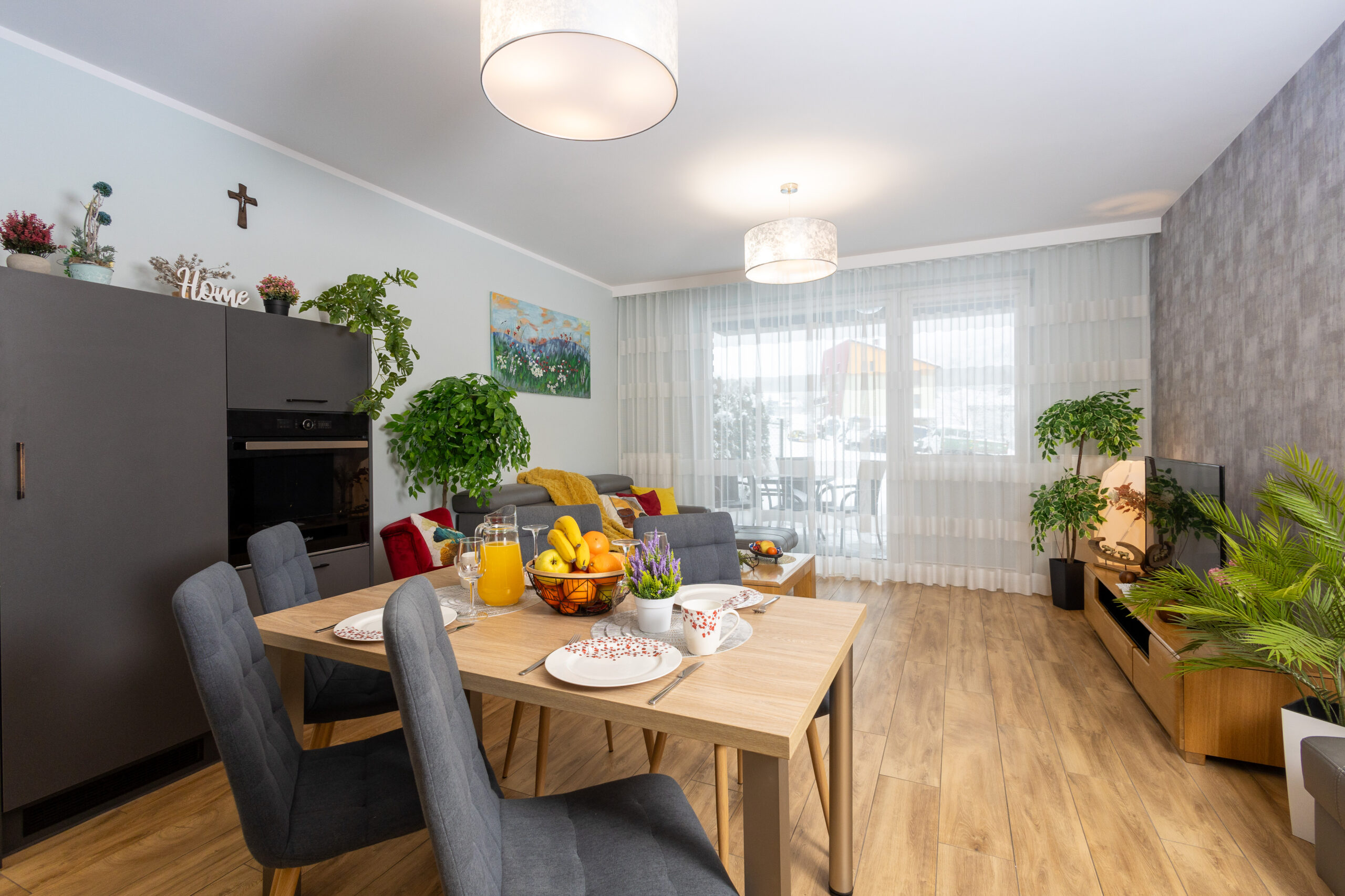 - Salon – wyposażony jest w wygodną rozkładaną sofę, stół z krzesłami, telewizor i stolik kawowy. Wyjście na duży taras z meblami ogrodowymi umożliwia relaks z przepięknymi widokami na trasy zjazdowe i góry