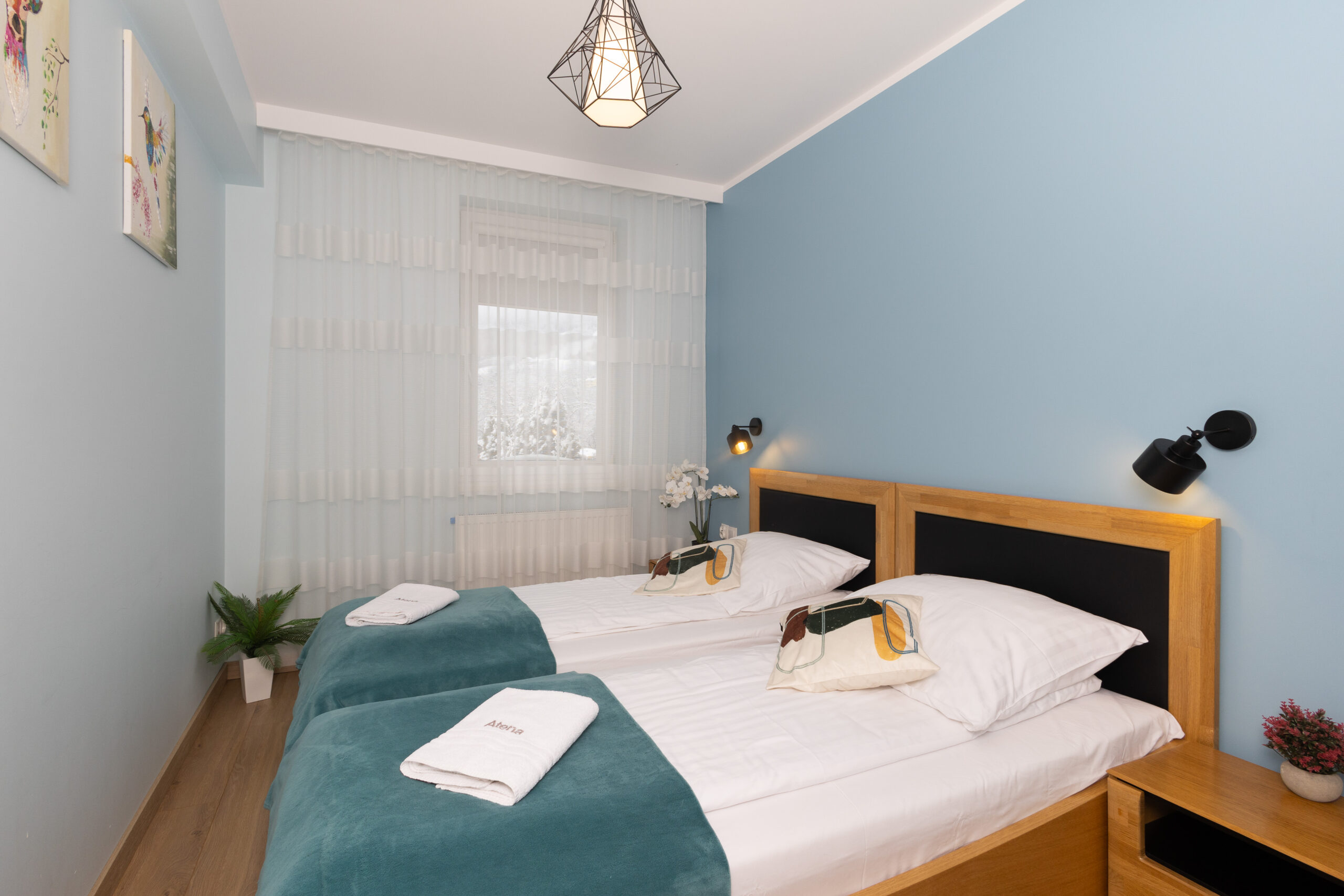 Atena to wyjątkowy apartament w Szczyrku o imponującej powierzchni 65 m2, stanowiący luksusowy wypoczynek dla 6 osób. Położony na parterze nowoczesnego budynku, oferuje niepowtarzalny widok na pobliskie szczyty gór. Jest to jeden z dziewięciu apartamentów w tej ekskluzywnej lokalizacji w Szczyrku, wyróżniający się nowoczesnością oraz unikatowymi, ręcznie malowanymi obrazami inspirowanymi naturą.