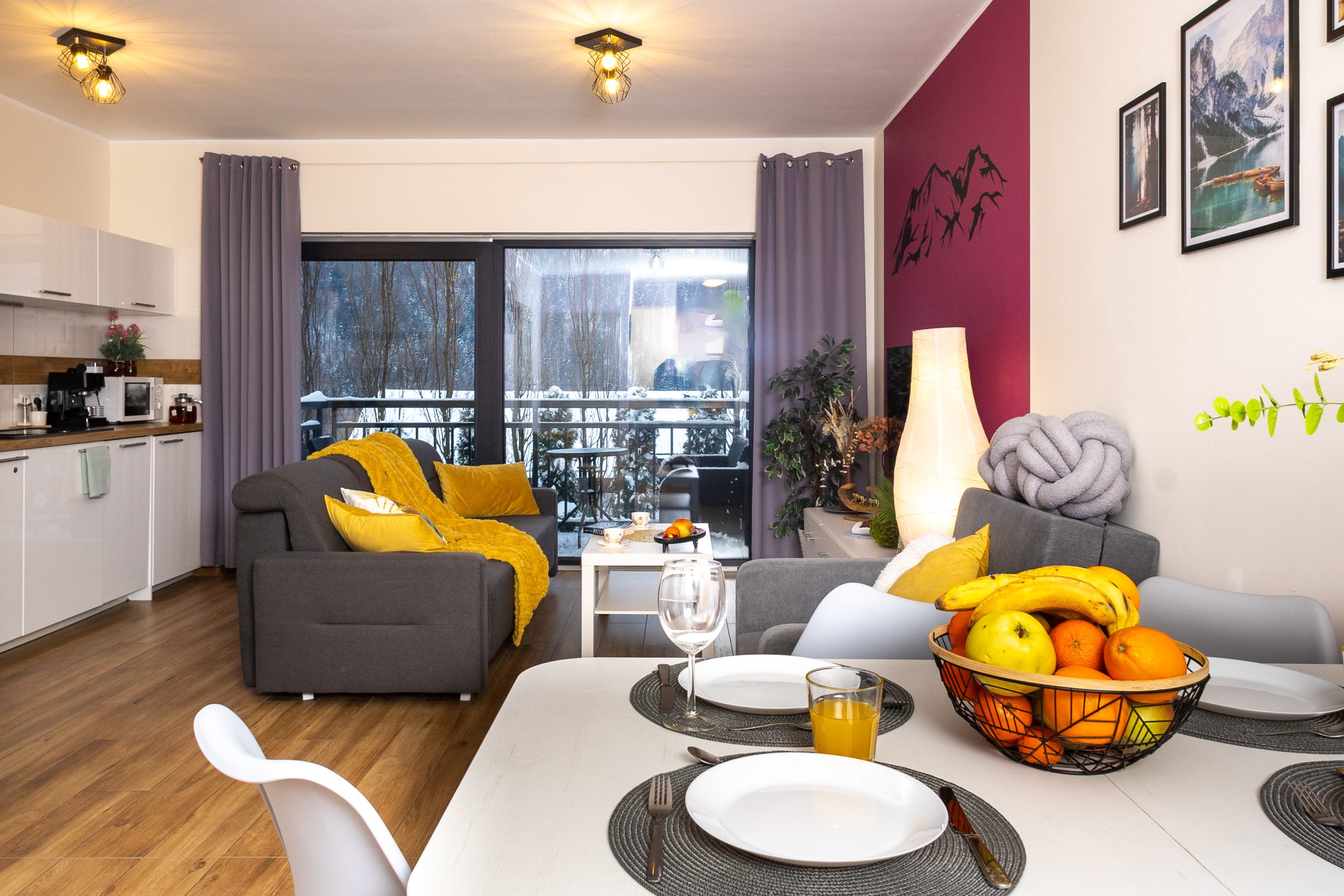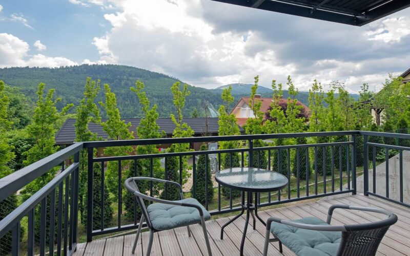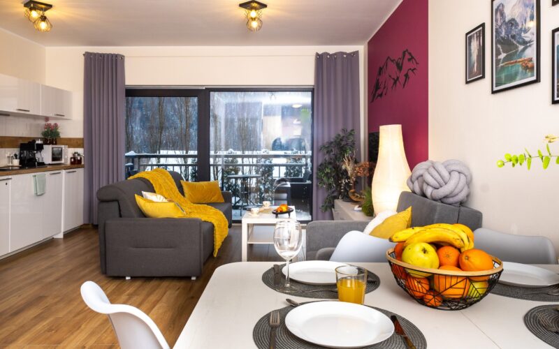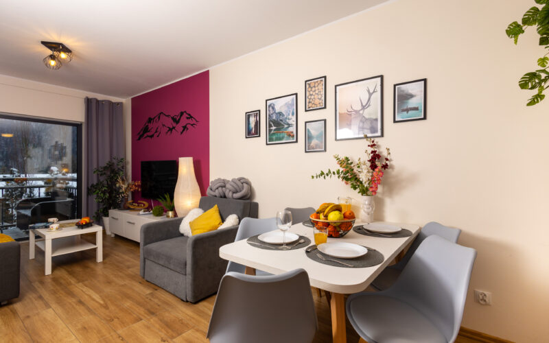 Wnętrze apartamentu, utrzymane w nowoczesnym stylu z subtelnie wprowadzonymi akcentami górskimi, sprawia, że goście czują się jak w oazie spokoju. Z tarasu apartamentu roztacza się malowniczy widok na pobliskie szczyty gór oraz imponujący kompleks skoczni narciarskich, co dodaje niepowtarzalnego uroku każdemu pobytowi.