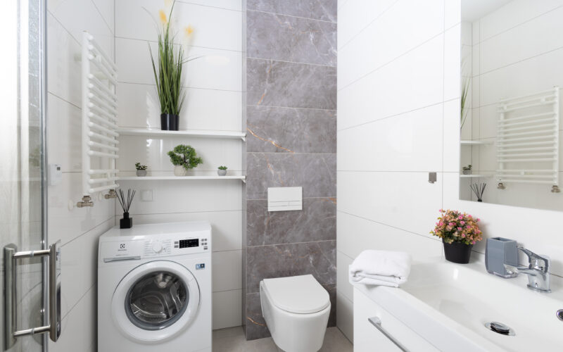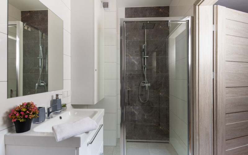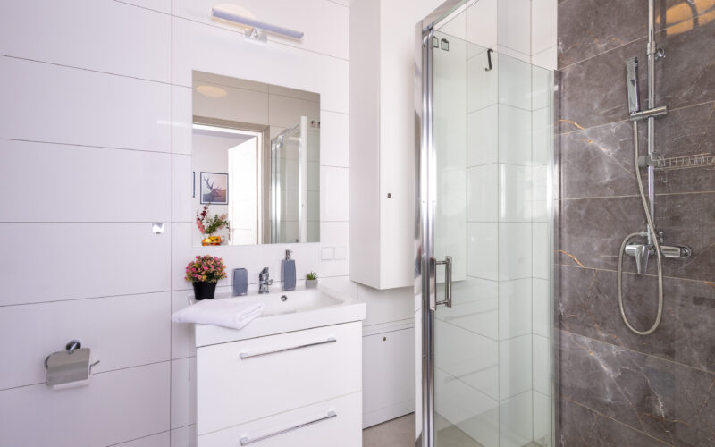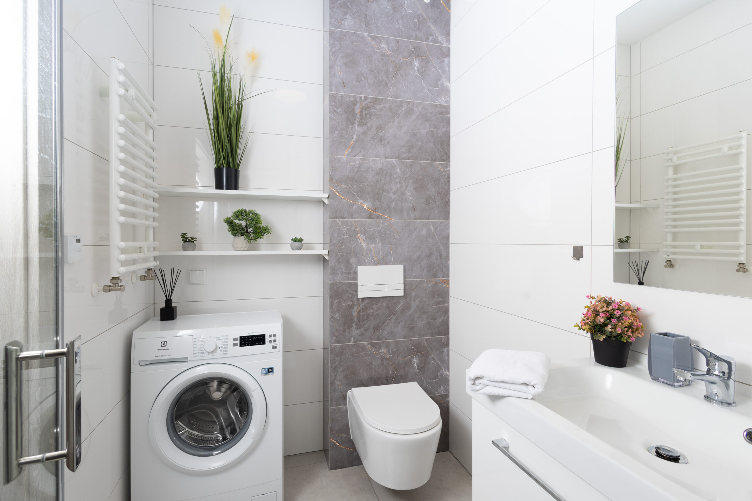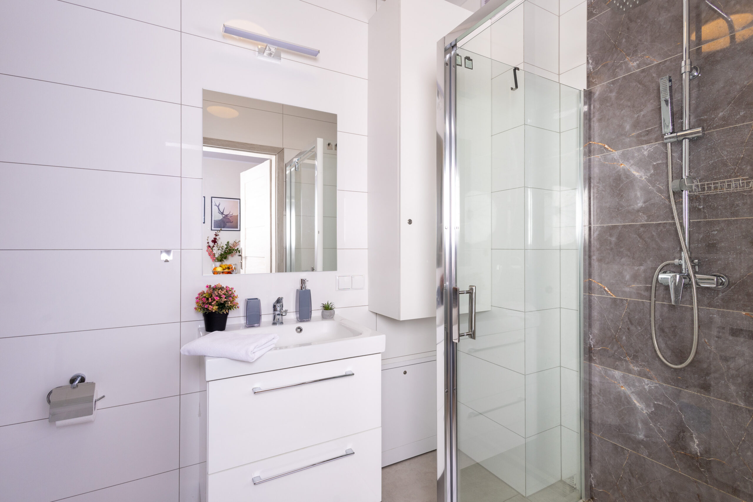 - Łazienka – z prysznicem, wc, umywalką, dużym lustrem, pralką i ręcznikami