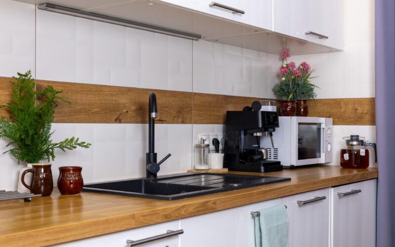 - Aneks kuchenny – jest w pełni wyposażony, znajduje się tu lodówka, zmywarka, płyta kuchenna, mikrofalówka, czajnik oraz przybory kuchenne, garnki, patelnia, naczynia, kieliszki.